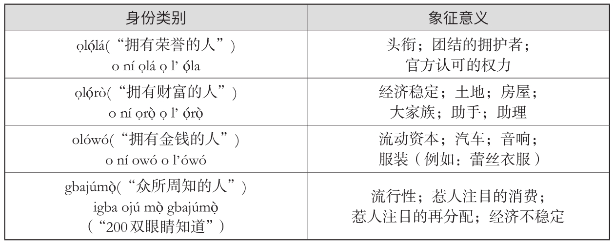 (“荣誉”)一词,意味着这些人拥有官方认可的、稳定的权力。这些阶层的典型分类由P. C.劳埃德(P. C. Lloyd)于1974年提出,对于理解现在的伊巴丹约鲁巴社会结构仍有显著意义。事实上,这些概念也频繁地应用于