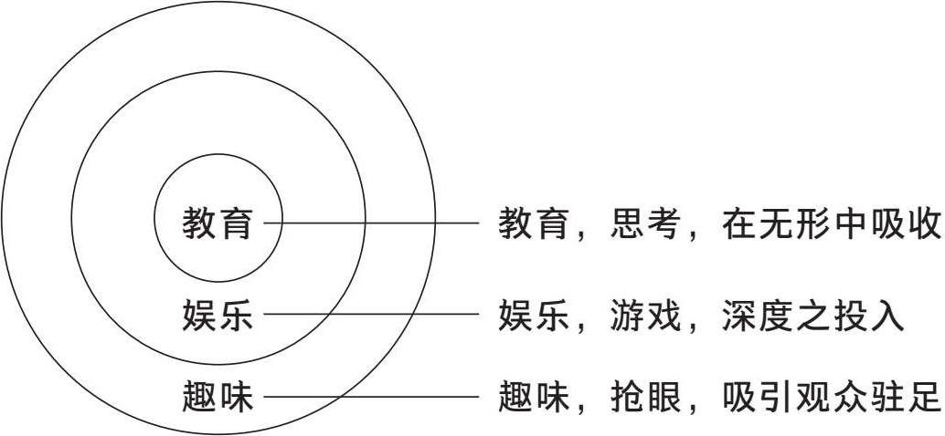 展示的最外层只是一个有趣的外表,这是吸引观众驻足的主要原因。在观众驻足之后,开始投入展示的情景中,此时必须产生娱乐性的效果,以便诱导观众产生深入的兴趣,得到游戏之满足。到此一般娱乐事业之目标已达,可是对于博物馆而言,这都只是手段而已,核心的目标是教育效果。在游戏中学到的知识或体会到的思想才是博物馆要完成的目标。