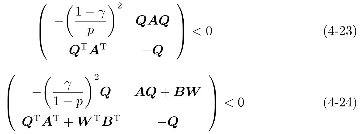 首先选择一适当的 γ 满足0< γ <1,解下面的关于未知矩阵 Q 和 W 的矩阵不等式