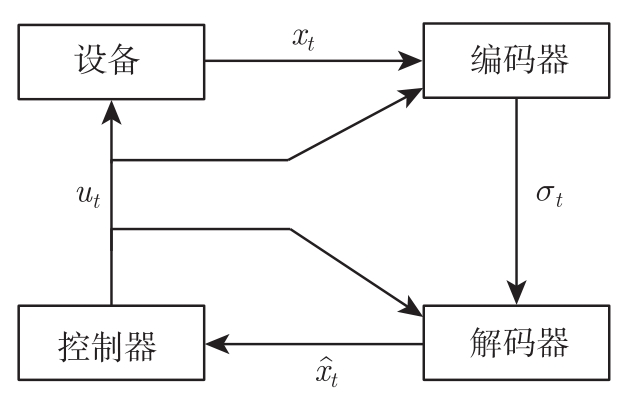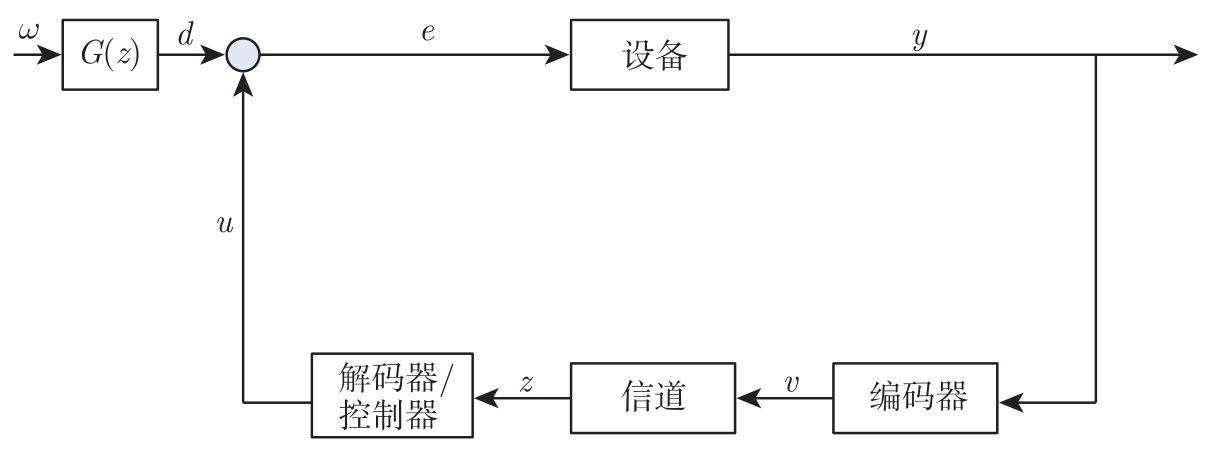 以上介绍的结果都针对确定性系统,文献[43-49]考虑了随机系统。文献[43]考虑部分可观测线性高斯系统在码率受限条件下保二次型代价控制问题,表明如果测量信号通过最小方差滤波器,且选择滤波器的输出为量化器的输入,则编码器与控制器可分别设计(分离原理)。文献[48]在更一般条件下考虑线性高斯系统的分离原理和确定性等价原理,给出加性高斯白噪声信道和无噪声信道的码率失真的理论下界。文献[49]给出在线性定常控制器条件下,使用一致量化器和变长编码,保证单输入单输出线性定常高斯系统稳定的充要条件。文献[47]考虑具有非高斯噪声的线性系统的均方稳定问题,得到时间渐进均方状态范数(Time-Asymptotic Mean Square State Norm)的下界。这个下界表明当码率接近系统的本征熵率(Intrinsic Entropy Rate) H 时,不管何种编码方案和控制方案,状态的均方值都将变得任意大。文献[44]也有类似的结果,显示当反馈信道的香农容量 C 向 H 降低时,控制器控制系统输入功率谱的能力降低。