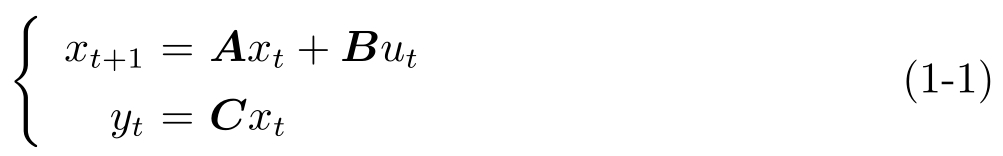 这里 x t ∈R d 是系统状态, u t ∈R m 是控制输入, y t ∈R l 是系统输出, A 、 B 、 C 是适当维数的矩阵。