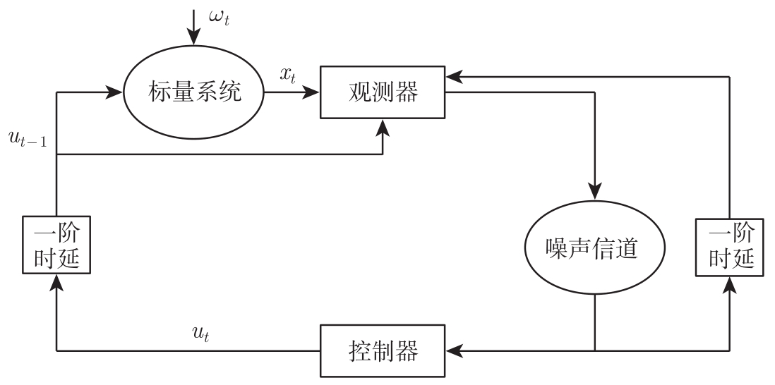 文献[52]引入任意时间容量(Anytime Capacity)概念,指出如果控制目标是矩稳定的,则任意时间容量才是噪声信道的指标,而不是香农容量。考虑下面的一阶系统(见图1-3):