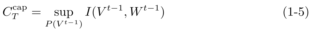 定义1.2 [56] 给定信道{ P ( W t | V t ,W t -1 )},在[0, T ]时间上的香农容量定义为