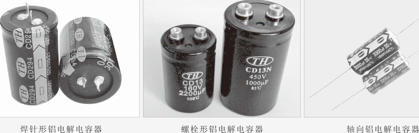 铝电解电容器的规格多种多样,外形也根据制作工艺有所不同,常见的有焊针形铝电解电容器、螺栓形铝电解电容器、轴向铝电解电容器,如图3-11所示。