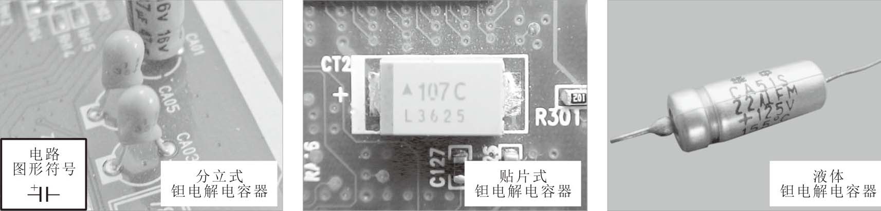 钽电解电容器是用金属钽作为正极材料的电容器,主要有固体钽电解电容器和液体钽电解电容器。固体钽电解电容器根据安装形式的不同,分为分立式钽电解电容器和贴片式钽电解电容器,如图3-12所示。钽电解电容器的温度特性、频率特性和可靠性都比铝电解电容器好,漏电电流极小,电荷储存能力好,寿命长,误差小,价格较高,通常用于高精密的电子电路。
