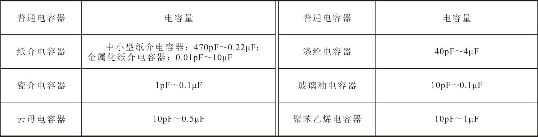 电容器的种类很多,根据电容量是否可调分为固定电容器和可变电容器;根据电容器引脚是否有极性分为无极性电容器和有极性电容器(电解电容器)。归纳起来,电容器分为普通电容器、电解电容器和可变电容器,如图3-1所示。