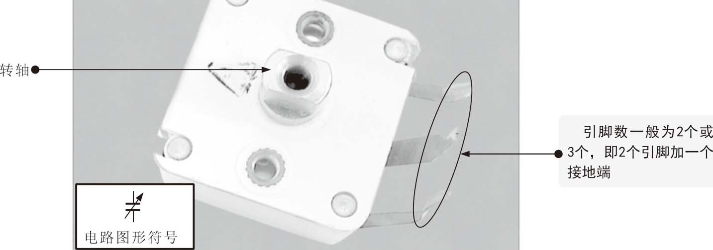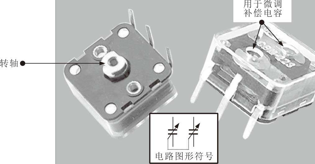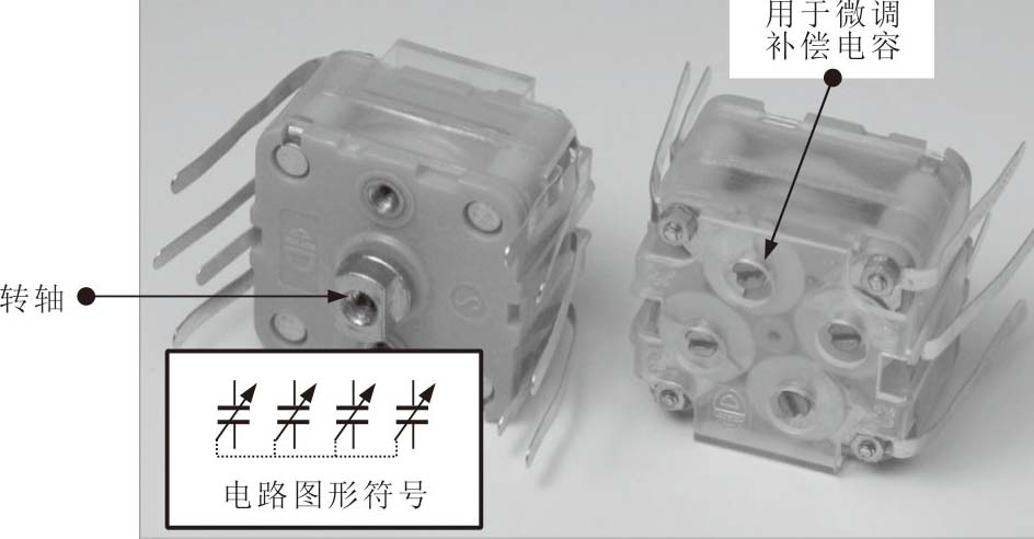 由图3-17可知,双联可变电容器中的两个单联可变电容器都各自附带一个补偿电容。补偿电容的电容量可以单独微调,一般从双联可变电容器的背部可以看到:如果是双联可变电容器,则可以看到两个补偿电容;如果是四联可变电容器,则可以看到四个补偿电容;如果是单联可变电容器,则只有一个补偿电容。由于生产工艺的不同,可变电容器的引脚数并不完全统一。通常,单联可变电容器的引脚数一般有2个或3个,双联可变电容器的引脚数不超过7个,四联可变电容器的引脚数为7~9个。