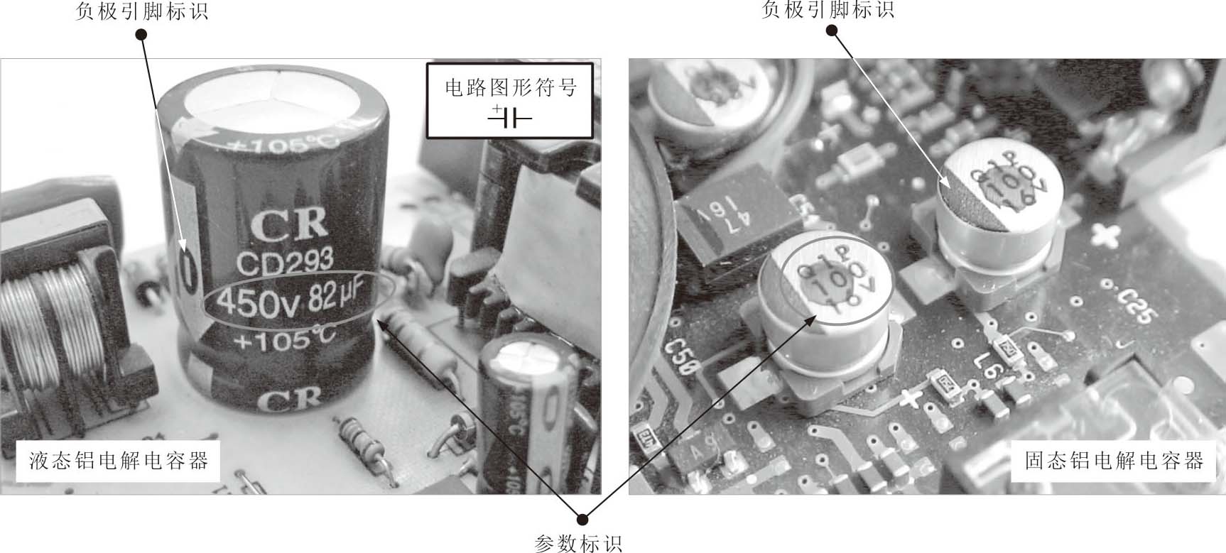 铝电解电容器的电容量较大,与无极性电容器相比,绝缘电阻低,漏电电流大,频率特性差,电容量和损耗会随着周围环境和时间的变化而变化,当温度过低或过高时,若长时间不用,就会失效,多用于低频、低压电路,如图3-10所示。