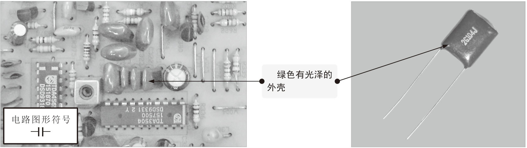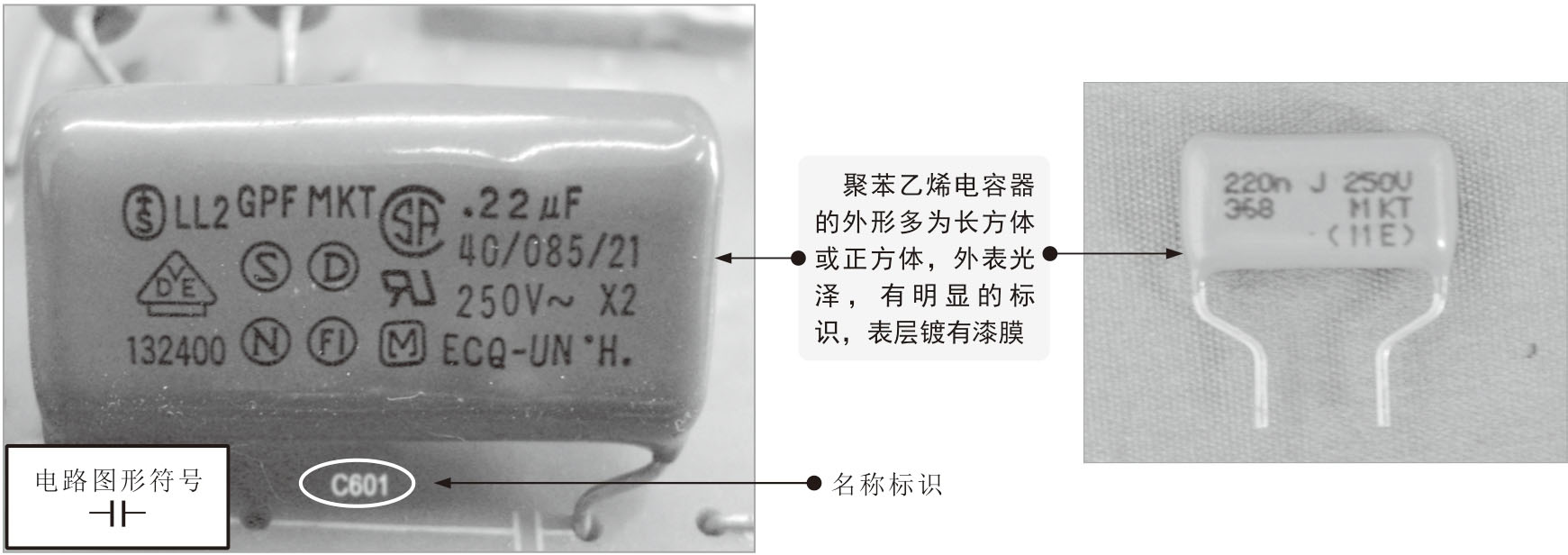 聚苯乙烯电容器是用非极性的聚苯乙烯薄膜作为介质的电容器,如图3-9所示,成本低,损耗小,绝缘电阻高,电容量稳定,多用于对电容量要求精确的电路。