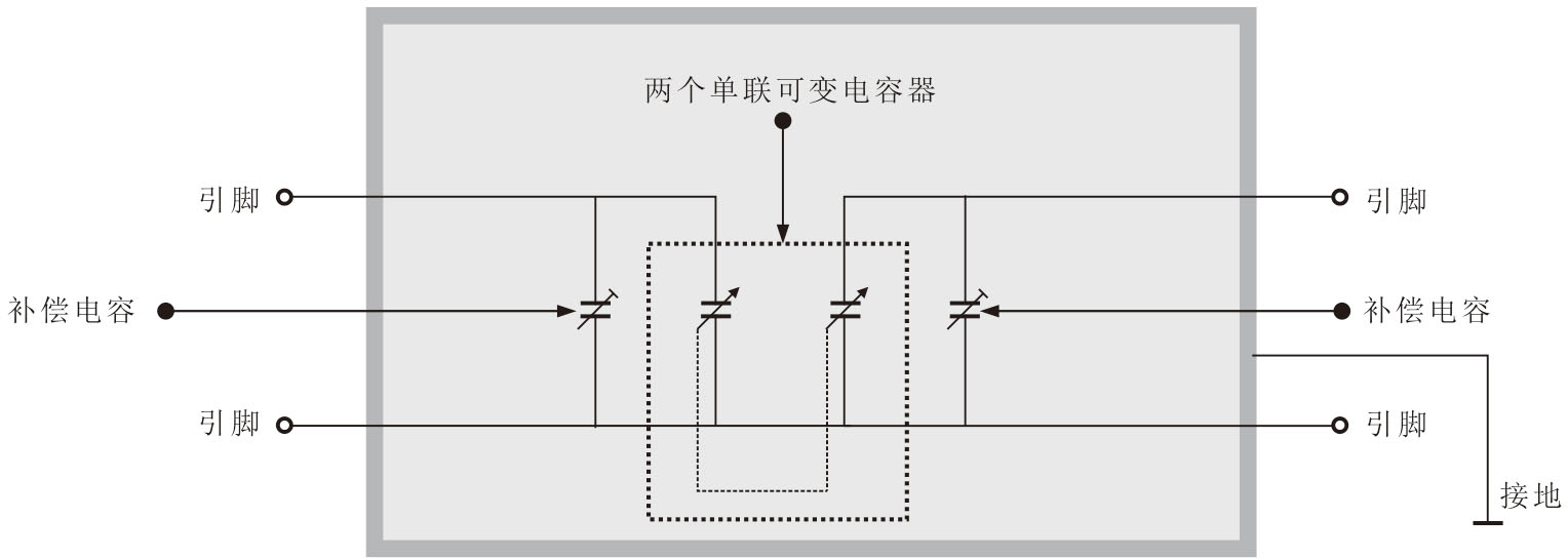 单联可变电容器、双联可变电容器和四联可变电容器可以通过引脚和背部补偿电容的数量来区分。以双联可变电容器为例,内部结构示意图如图3-17所示。