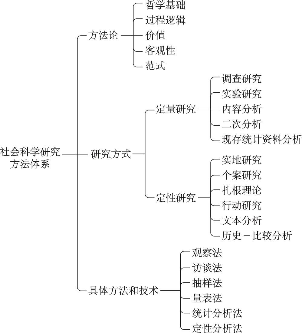 作为科学一部分的社会科学,也具有一套特定的、有着不同层次的、比较完整的研究方法体系。这一体系中,主要包括方法论、研究方式、具体方法和技术三个大的层次。最高的层次是方法论,它主要涉及社会科学研究的哲学基础和研究过程的逻辑,探讨与社会现象的性质及对其的理解、社会科学研究者的价值与研究的关系、社会科学研究的客观性、社会科学研究的不同范式等相关的问题。中间的层次是研究方式,它指的是研究所采取的具体形式或研究的具体类型。从大的方面看,研究方式可划分为定量研究和定性研究两大类。两大类中又分别包含诸如调查研究、实验研究、现存统计资料分析以及实地研究、个案研究、行动研究等多种不同的方式。研究设计的任务之一,就是根据研究目标选择和确定具体的研究方式。最低的层次是具体方法和技术,主要包括各种资料收集的方法和技术,比如观察法、访谈法、抽样法等,以及资料分析的方法和技术,比如各种统计分析技术等。社会科学研究方法体系可用图1-1简要表示。