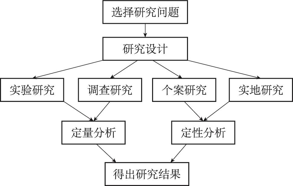 如果将上述几个阶段中的收集研究资料和分析研究资料合并为研究实施阶段的话,那么这一过程可以进一步简化为“问题→设计→实施→答案”。这就是最一般的社会科学研究过程,也可以说是研究的基本构成。它不仅说明研究包含这四个主要的环节,也说明研究就是从问题到设计、再从设计到实施、最后从实施到答案的一个过程。当这个过程走完时,一项具体的研究就完成了。