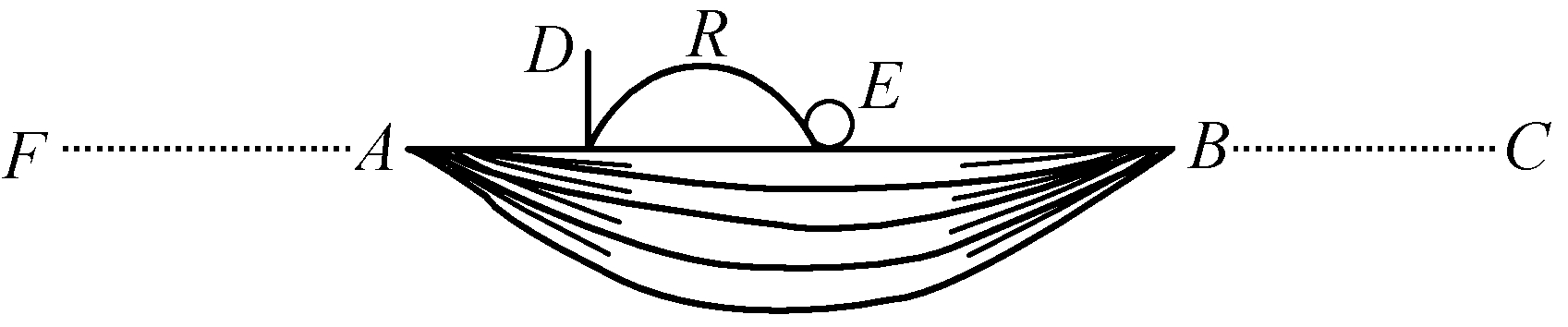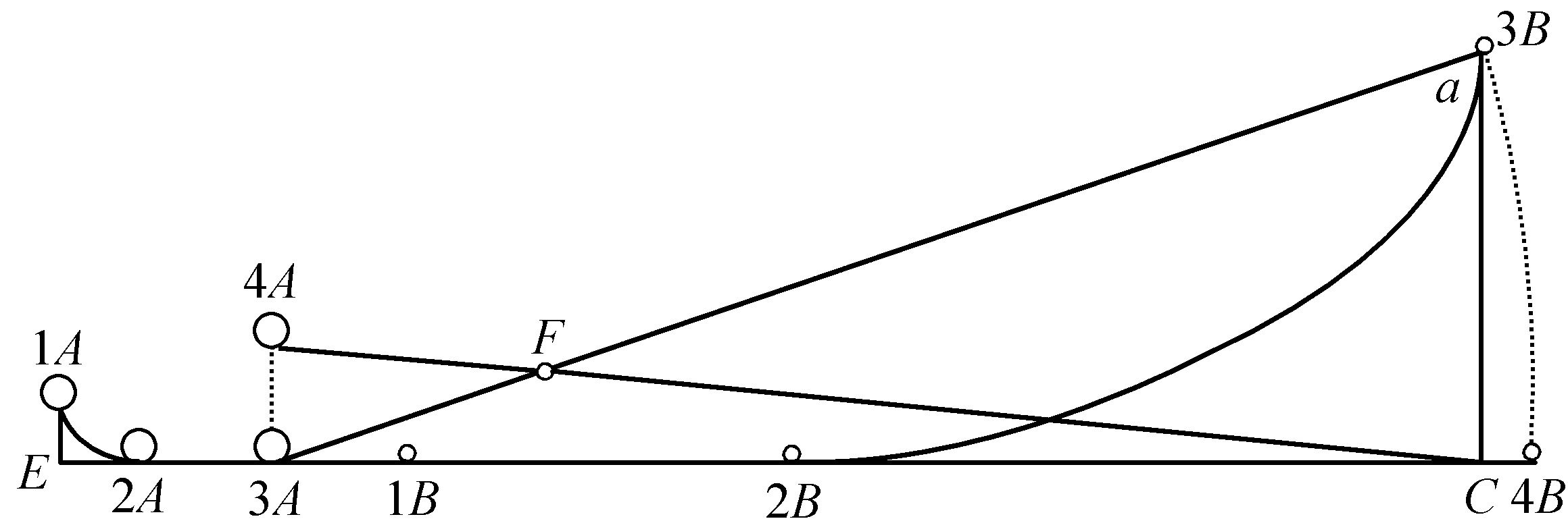 要证明这一点,我们只需要回到尤林的例子(第110节)。也就是说,驳船AB以等于1的速度自C向B运动。此外我们要设定,球体E沿着同样的方向,即沿着方向CB运动,但这是一种自由运动,利用的是活力,其速度等于2,因而这个球体仅仅以1个单位的速度与此处一根弹簧表现出来的、其力等于1的障碍R相遇;原因在于,就另一个单位的速度而言,它对于这个障碍来说并不以该单位运动,因为这一障碍同样有沿着同一方向的这种运动,从而物体在与这一障碍的关系中仅仅剩下1个单位的运动。但就1个单位的运动而言,力也仅仅等于1,所以球体是以等于1的力与同样只有1个单位的力的障碍相撞的,从而由于这个障碍而失去了它的这个单位的速度和力。在这种情况下,它仅仅剩下了1个单位的绝对运动,从而也只剩下了1个单位的力,可以再让另一个等于1的障碍来消除;因此,我们设定有一种活力、从而以2个单位的速度拥有4个单位的力的物体,将被两个障碍归于静止;这两个障碍中的每一个都只有1个单位的力,因而按照这种方式必须有2个单位在这个物体中自己消失,不需要被外部原因抵消或者克服。