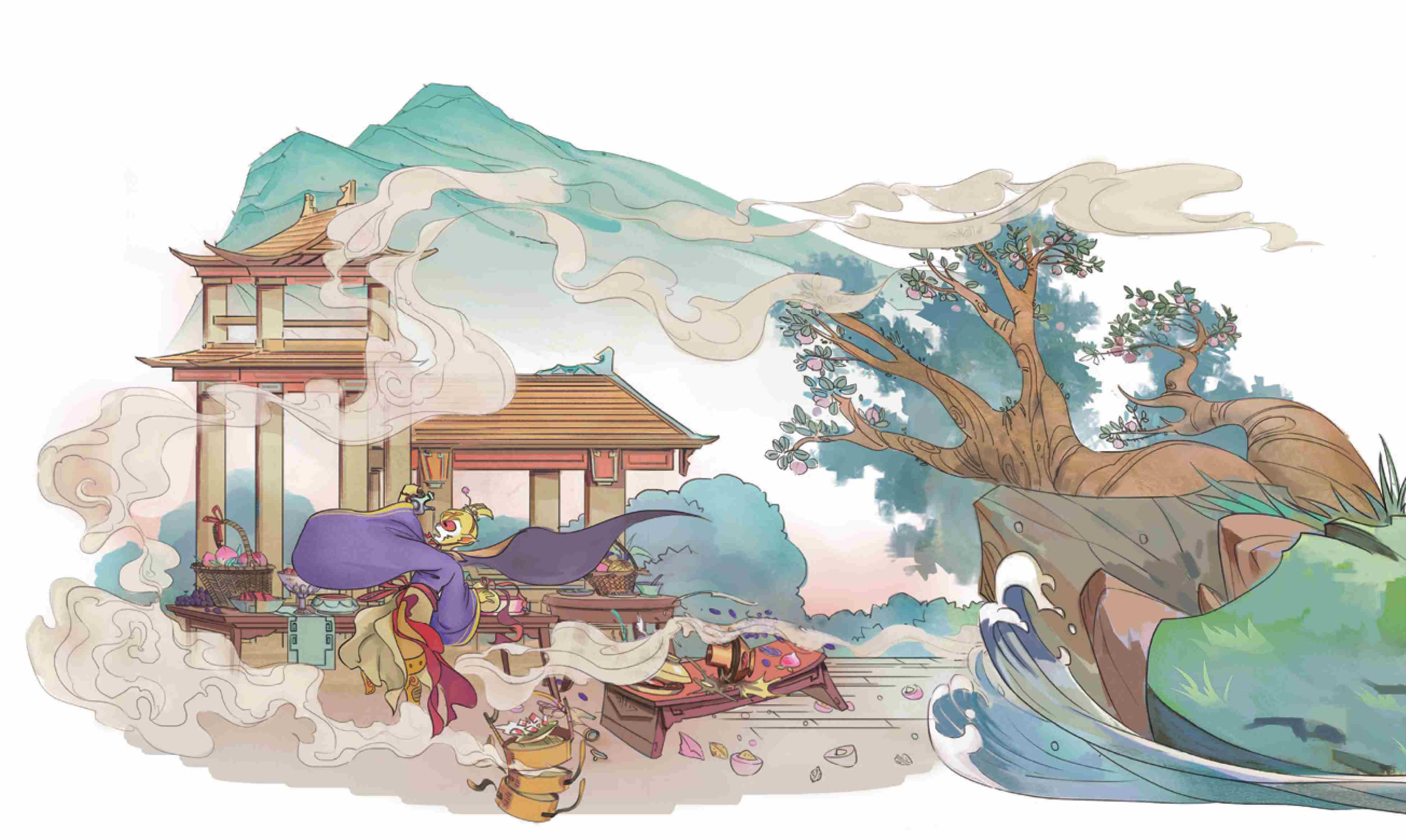 过了些日子,蟠桃刚熟,便被悟空吃了个精光。七仙女奉王母之命前来摘桃,悟空听说蟠桃宴遍请周天神佛,却根本没有自己的份儿,心下不平,非要凑个热闹不可。他把七仙女定在原地,一个筋斗云翻去蟠桃会,趁众神都还没来,把美食仙酒吃了个遍。之后,他醉醺醺地到处游荡,不觉走到了太上老君的兜率宫,见宫内空无一人,又将仙丹全倒出来,像吃炒豆一样乱吃一通。不一会儿,丹饱酒醒,他知道自己闯了大祸,索性离了天庭,回花果山去了。