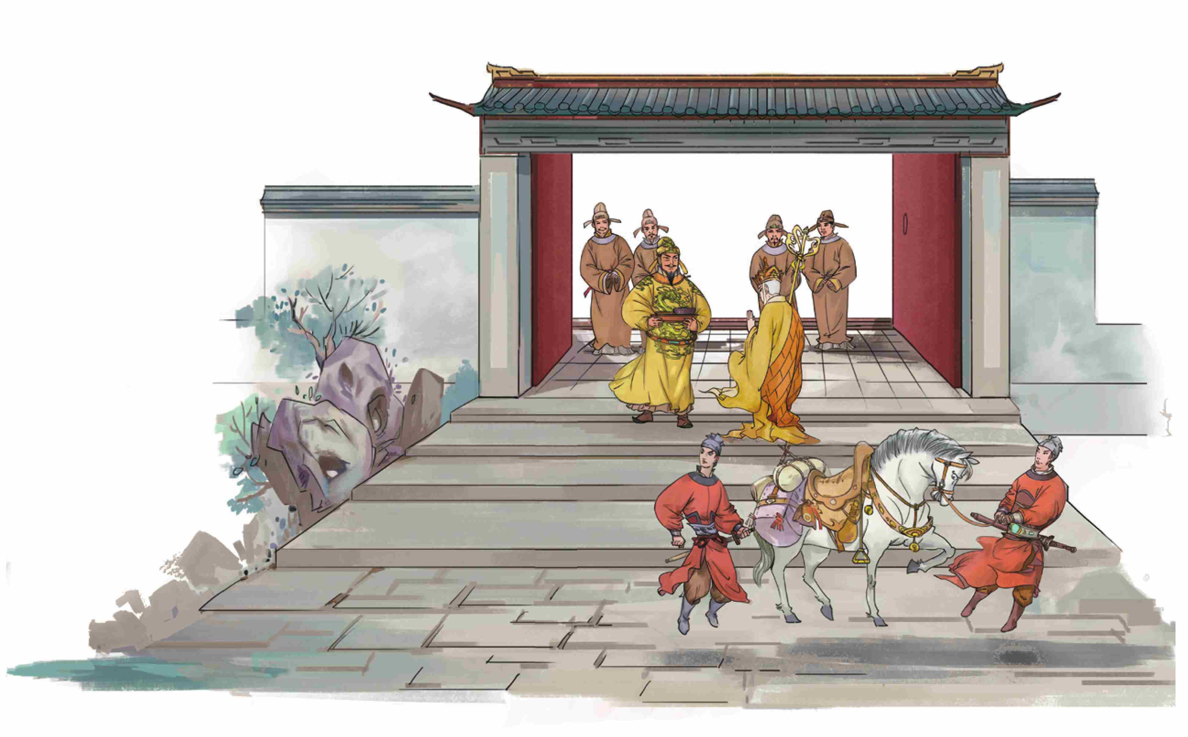 东土大唐的当朝皇帝就叫作李世民,他想要超度灭隋战争中死去的冤魂,正在召开水陆大法会,请高僧玄奘讲经说法。菩萨一见玄奘,便知他是佛祖的弟子金蝉子转世,只因听经打盹而被打下界来,是最合适的取经人。菩萨变成一个老和尚,前去面见皇帝,将佛赐的锦襕袈裟与九环锡杖送给了玄奘。菩萨说:“西方有大乘佛法三藏,可以度化众生、弘扬善果,远胜玄奘所讲的小乘佛法。”玄奘听了,表示愿去西方灵山求取真经。菩萨便现出真身,驾起祥云直上九霄,飘然离去。皇帝与百官见到菩萨真身,又惊又喜,连忙下拜。玄奘收拾行囊,便要上路,皇帝赐他一份通关文牒、一个紫金钵盂,还有一匹良马、两个随从,又与他结拜为兄弟,说道:“御弟没有俗家名字,听菩萨说佛法有三藏,御弟又出身大唐,便称为唐三藏如何?”三藏领了俗名,拜谢出关,就此西去。