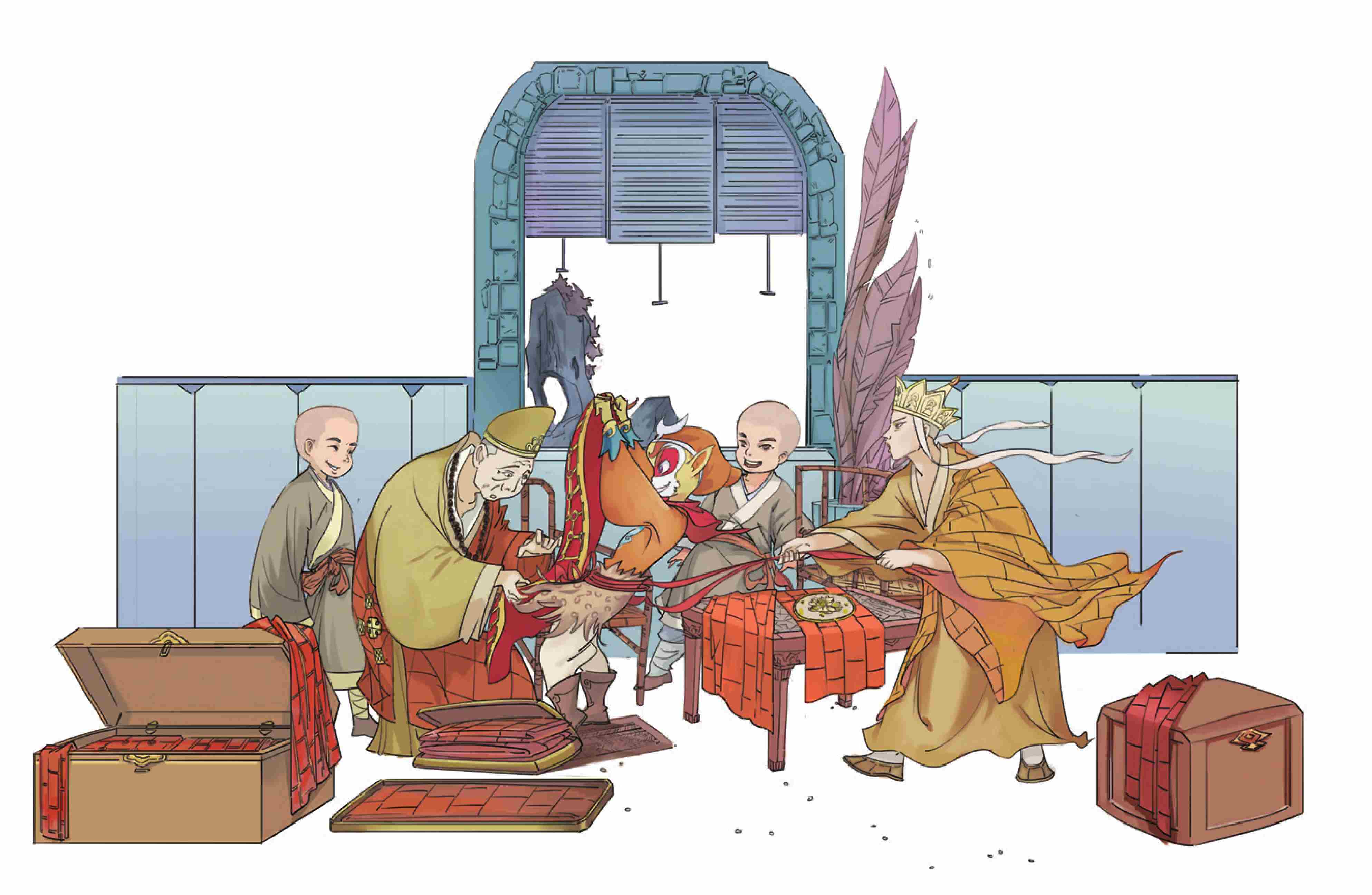 师徒两个策马前行,到了一座观音院,老院主金池长老对三藏说:“我虽活了二百七十岁,却不曾到过大唐,长老有什么天朝上国的宝贝,给我开开眼界?”悟空听了便说:“我师父有件袈裟,可是个宝贝。”老院主冷笑,邀三藏去看他收藏的袈裟,足有七八百件。悟空不肯服输,把师父的锦襕袈裟拿了出来,才一抖开,便有霞光满室,说不尽的璀璨耀眼,把那几百件俗物都比了下去。三藏一个劲儿地拦他,不许他炫耀财富,徒惹祸事,然而已经迟了。