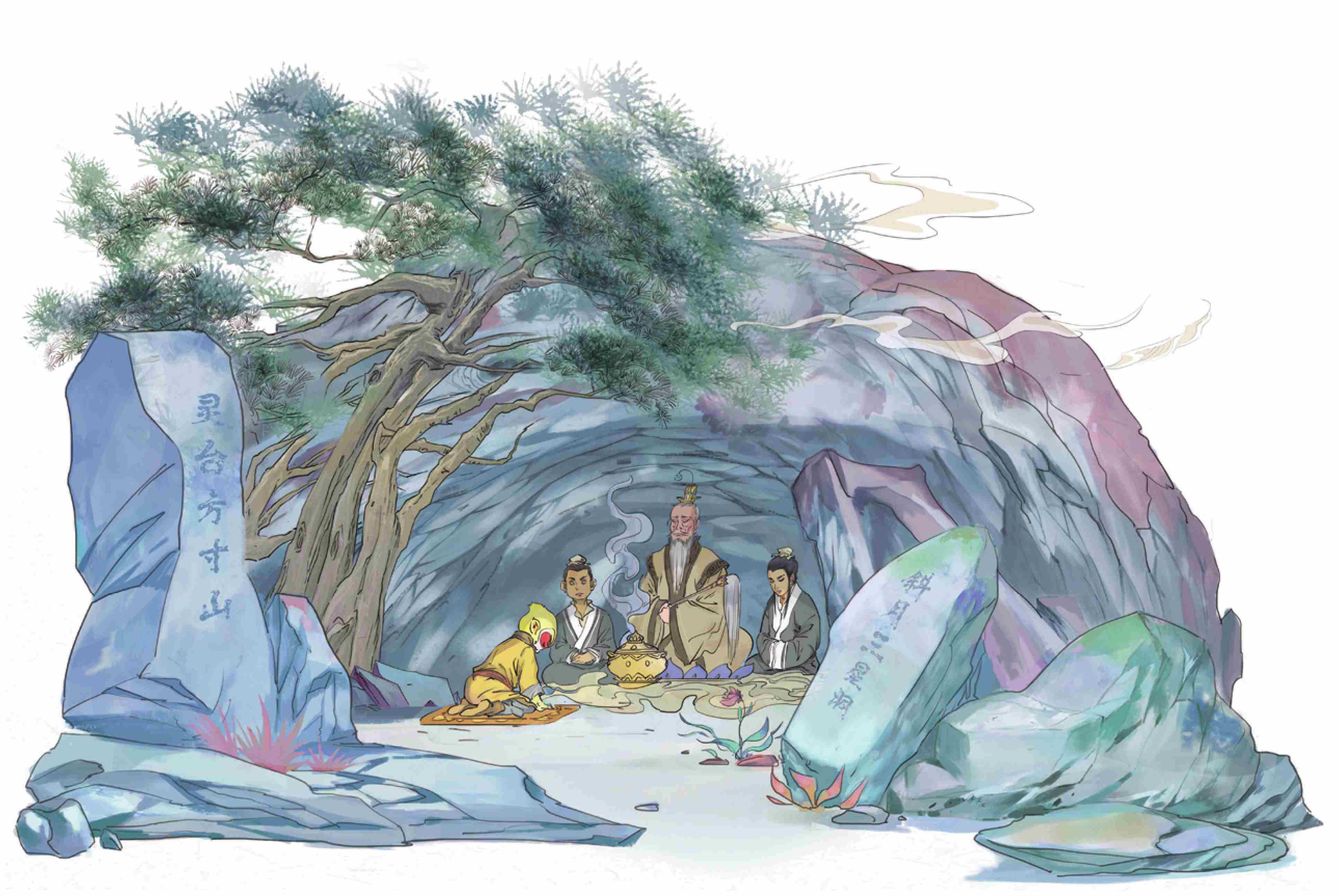 这座山叫作灵台方寸山,山中一片祥和,美如人间仙境,果然是个神仙洞府。山上有个斜月三星洞,住着一位菩提祖师,收了好多徒弟,在那里授业解惑。在樵夫的指引下,猴王上山去寻,果然找到了山门。他也不敢敲门,就在外面等着,摘了果子边吃边玩。不一会儿,里面走出个俊秀的道童,问道:“师父说门外有个修行的来了,让我来接,看来就是你了?”