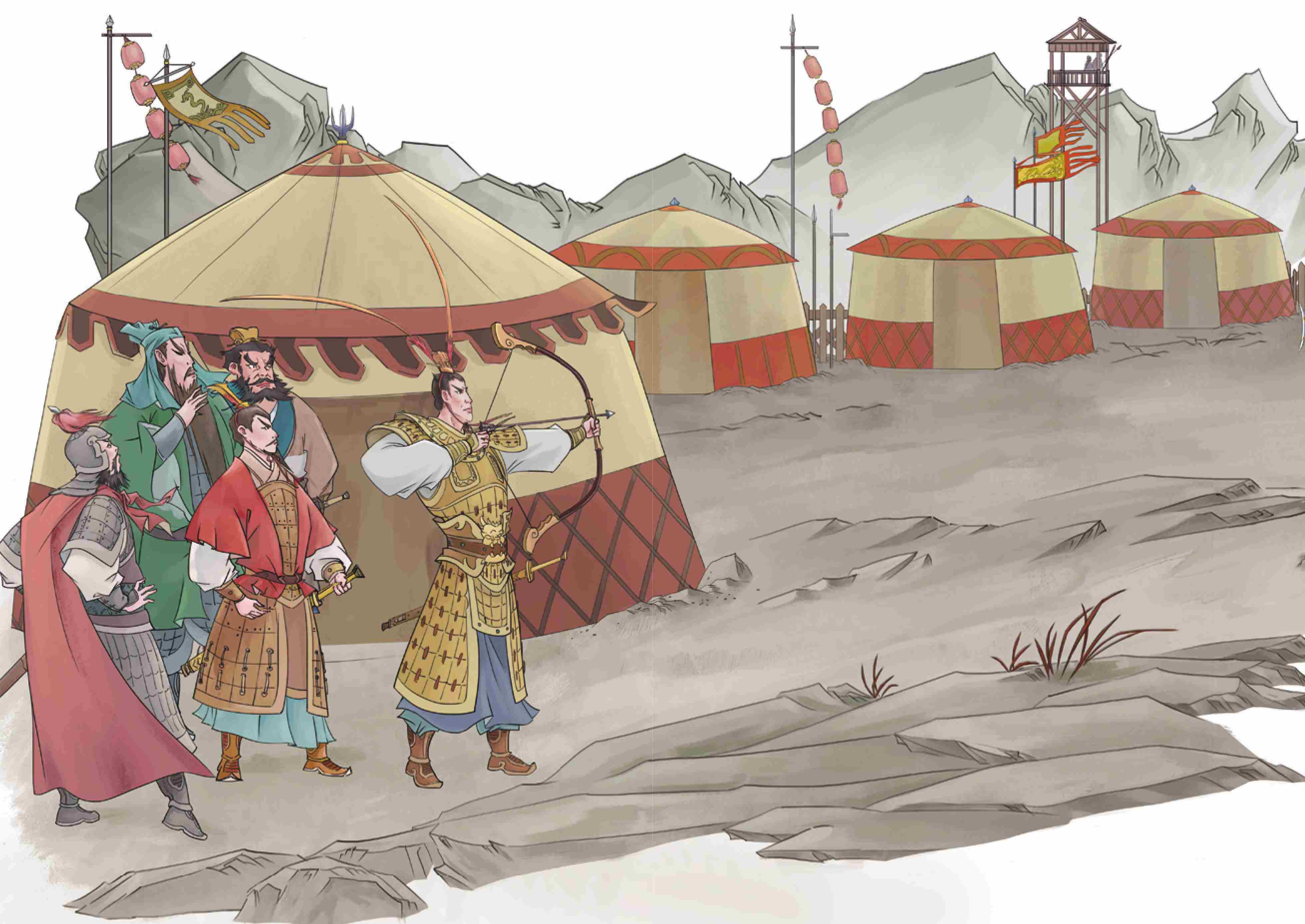 袁术命纪灵为将征讨刘备,又送吕布粮草使其按兵不动。吕布心想:“刘备驻小沛对我并无威胁。袁术吞并刘备,我却难免唇亡齿寒。”因此不愿去杀刘备,可也不愿与袁术结仇,便约了纪灵与刘备到辕门,为两家和解。吕布将方天画戟立在辕门外一百五十步处,对众人说道:“若我射中戟上小枝,你二人就此罢兵。如射不中,你们任意厮杀,我不再管。谁不从我,我便与另一家合力杀之!”说罢挽开袍袖,拉弓搭箭,一箭正中戟上小枝。