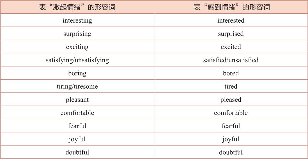 高考中与情绪相关的一类形容词值得特别注意。我们可以把interesting(使人感兴趣的,令人好奇的)等形容词称为“激起情绪”的形容词,把interested(对……感兴趣的)等形容词称为“感到情绪”的形容词。“激起情绪”的形容词表示客观上“令人……的”,“感到情绪”的形容词表示主观上“感到……的”。很多辅导资料把“激起情绪”的形容词总结为-ing形容词,把“感到情绪”的形容词总结为-ed形容词,这是对考生的误导,虽然在高考中有些表“激起情绪”的形容词由-ing形式转化而来、以-ing结尾,有些表“感到情绪”的形容词由过去分词转化而来、以-ed结尾,但是也存在不少其他的形式,甚至有些形容词既可表示“激起情绪”,又可表示“感到情绪”,集两种意思于一身。下表对常考词汇进行了总结: