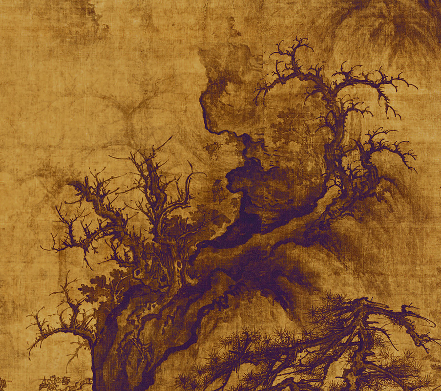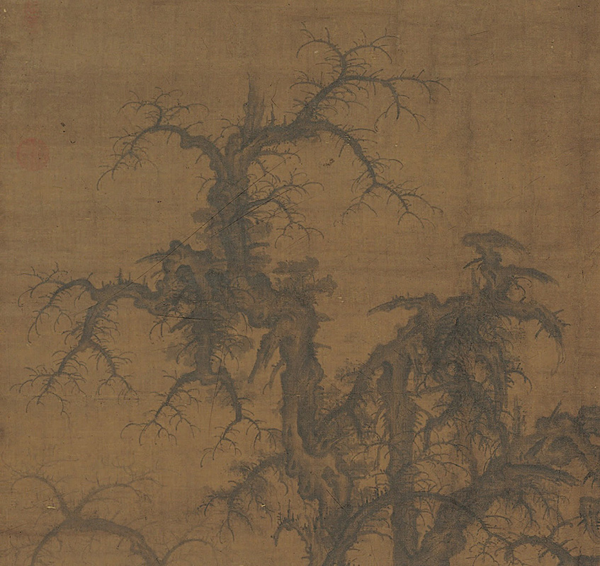 整幅画是竖轴大山大水全景式构图,中轴线上一座高峰耸立。但是这座高山跟范宽《溪山行旅图》那样敦敦实实的高山已经完全不一样了,有着灵活的曲线,细看下,画中的每座山都不是老老实实地直冲云霄,有了腰身,呈“S”形,正如画名所示,早春,万物复苏,山水在他笔下,慢慢醒了过来,生机勃勃。