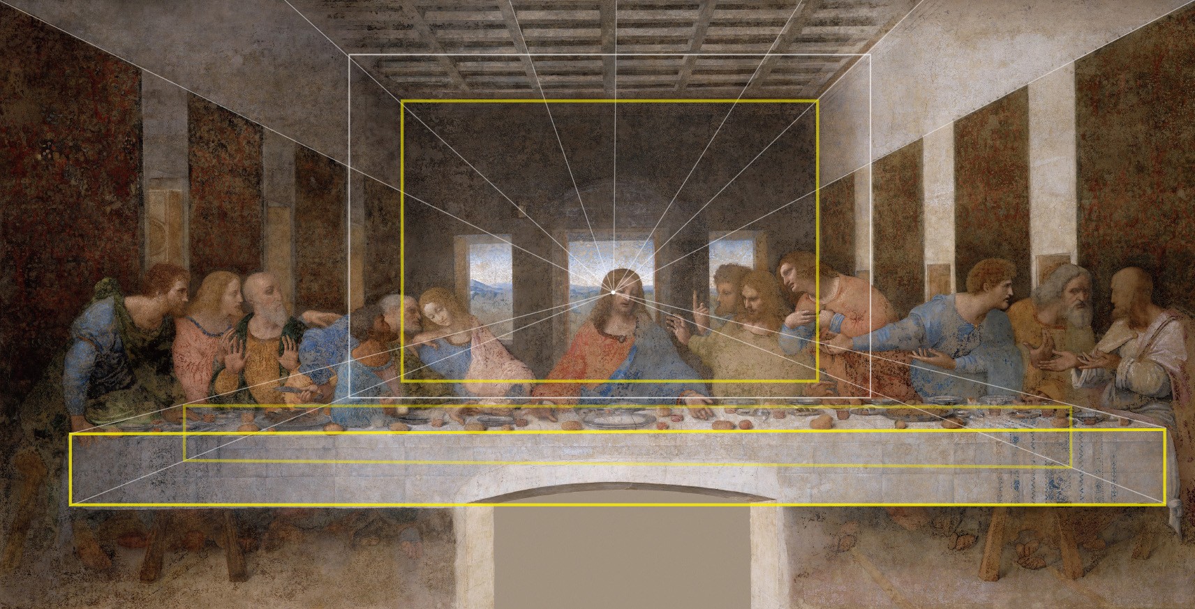 透视法模拟人眼,用投影原理,在二维画布上创造三维空间的错觉。例如下图《最后的晚餐》采用了“一点透视法”,消失点位于画面中心,耶稣的头部。整个空间都基于这个消失点来构筑,在画面上表现出“近长远短”“近大远小”的规律。