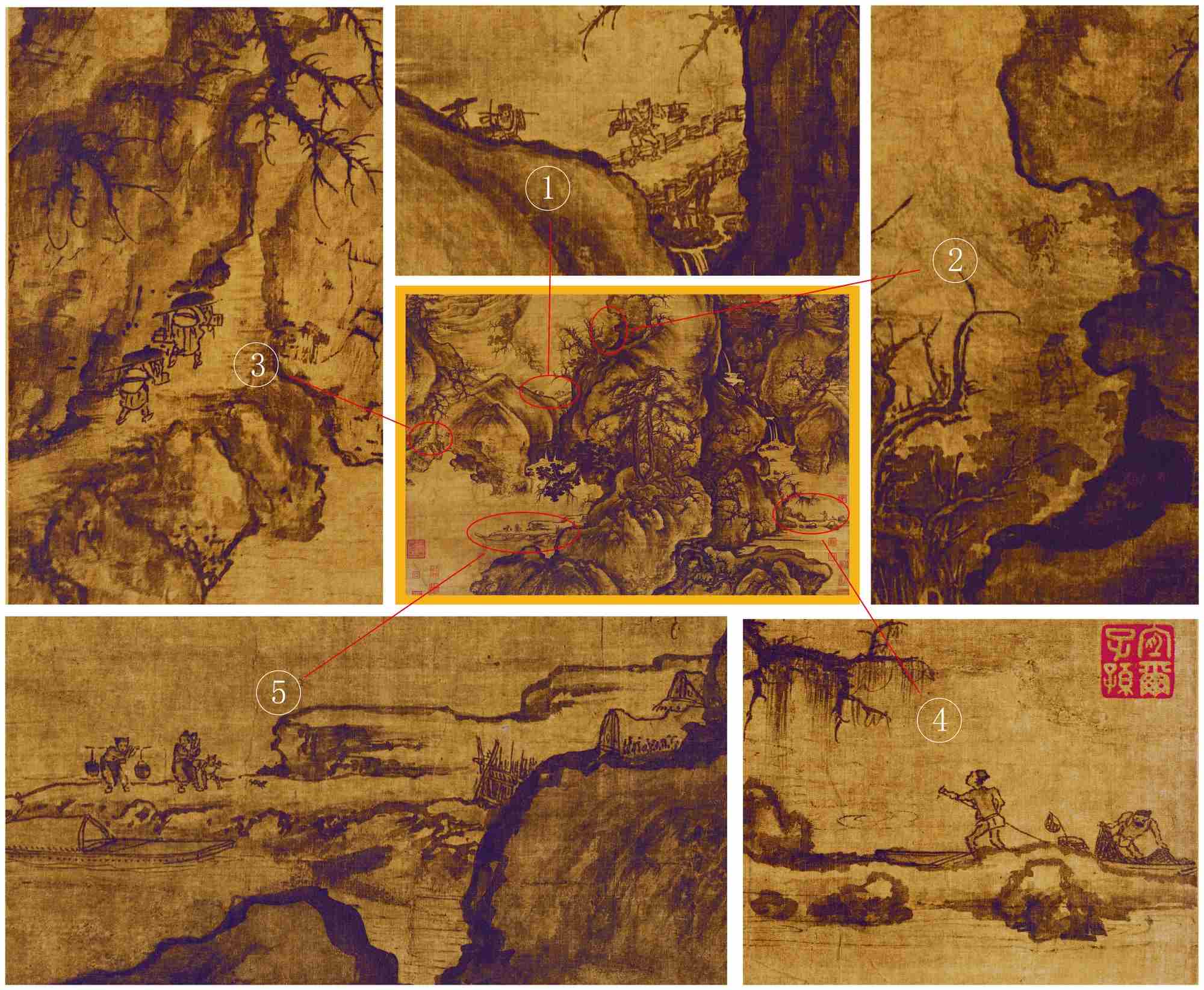 画面最下方河边,还画有好几个人物。右侧岸边有两个渔夫,应该是父子,儿子在摇橹,父亲在收网④,顺着岸边的大石头向左侧看过去,一位女性刚刚下船,岸边有个小男孩奔跑向她,还有一位长辈女性抱着一个婴儿,也在等她⑤。这几位应该是一家子,其乐融融,他们的家就是大岩石下简陋的茅屋。