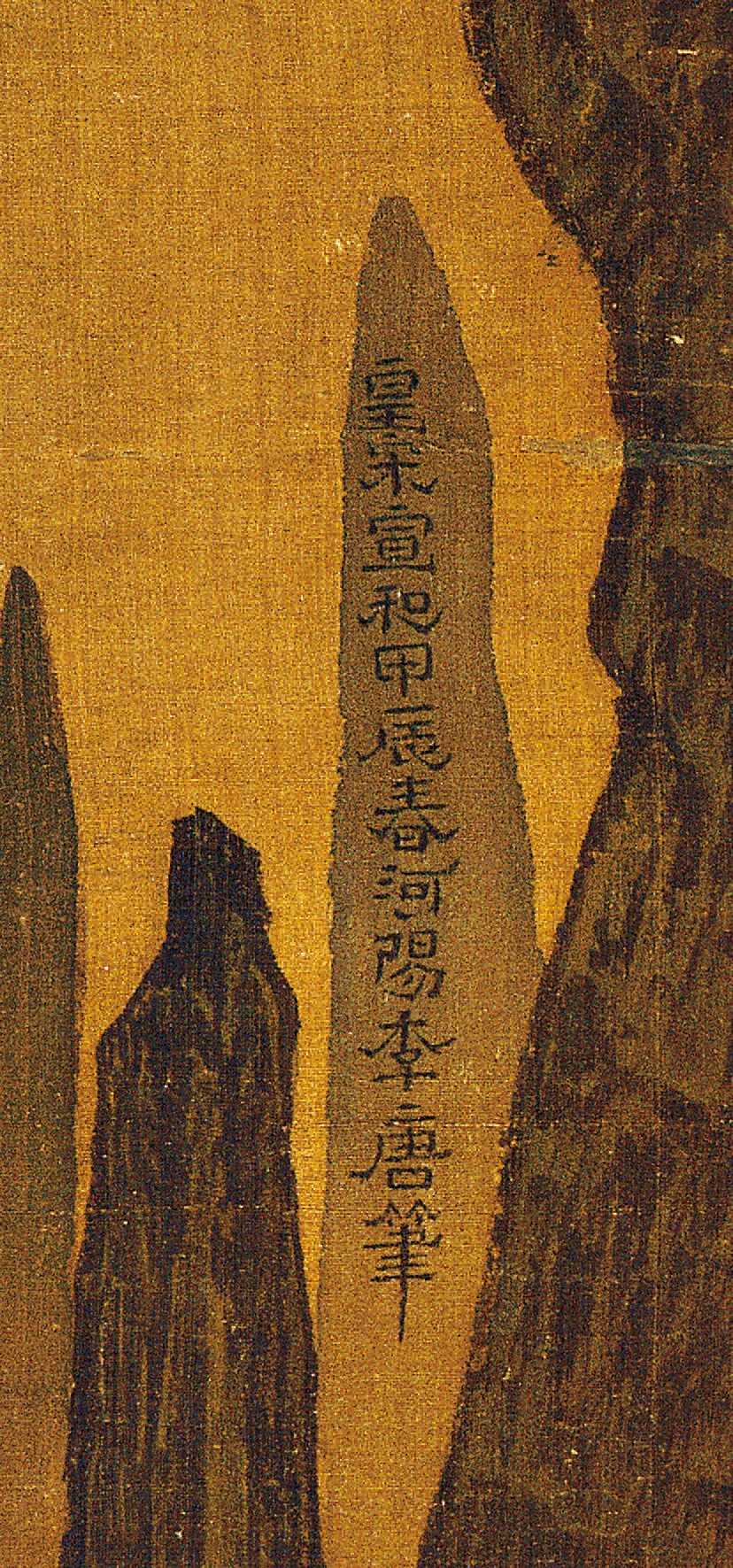 在画中,一座尖耸的远峰上题有“皇宋宣和甲辰春,河阳李唐笔”的隶书落款。宋朝之前,画家不会在画上写自己的名款,到了宋朝,画家为了不破坏画面的完整性,会在山峰上,树叶之间把自己的名字藏进去,不仔细看还以为是山石或者树木的纹理,这是画作断代非常重要的标准之一: 宋朝之前无签名,宋朝之后有签名。