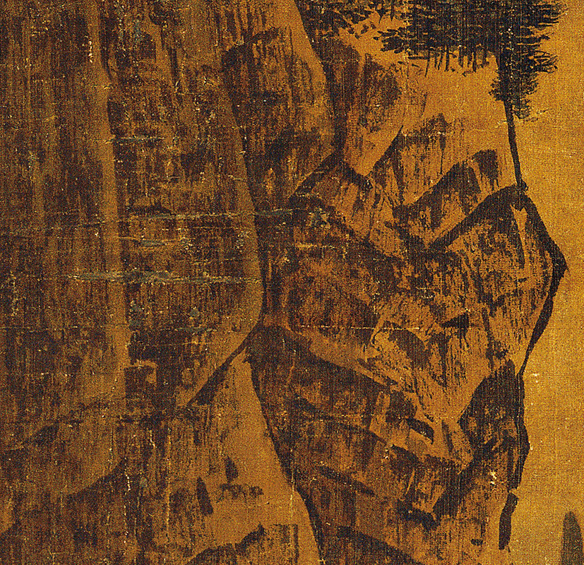 那么既然是学范宽,我们好像在画上看不到范宽惯用的技法雨点皴,但风格又非常相似。这就是李唐的巧思了。他把雨点皴拉长,把大雨滴变成了连绵不断的长线,这个技法,叫作“斧劈皴”。