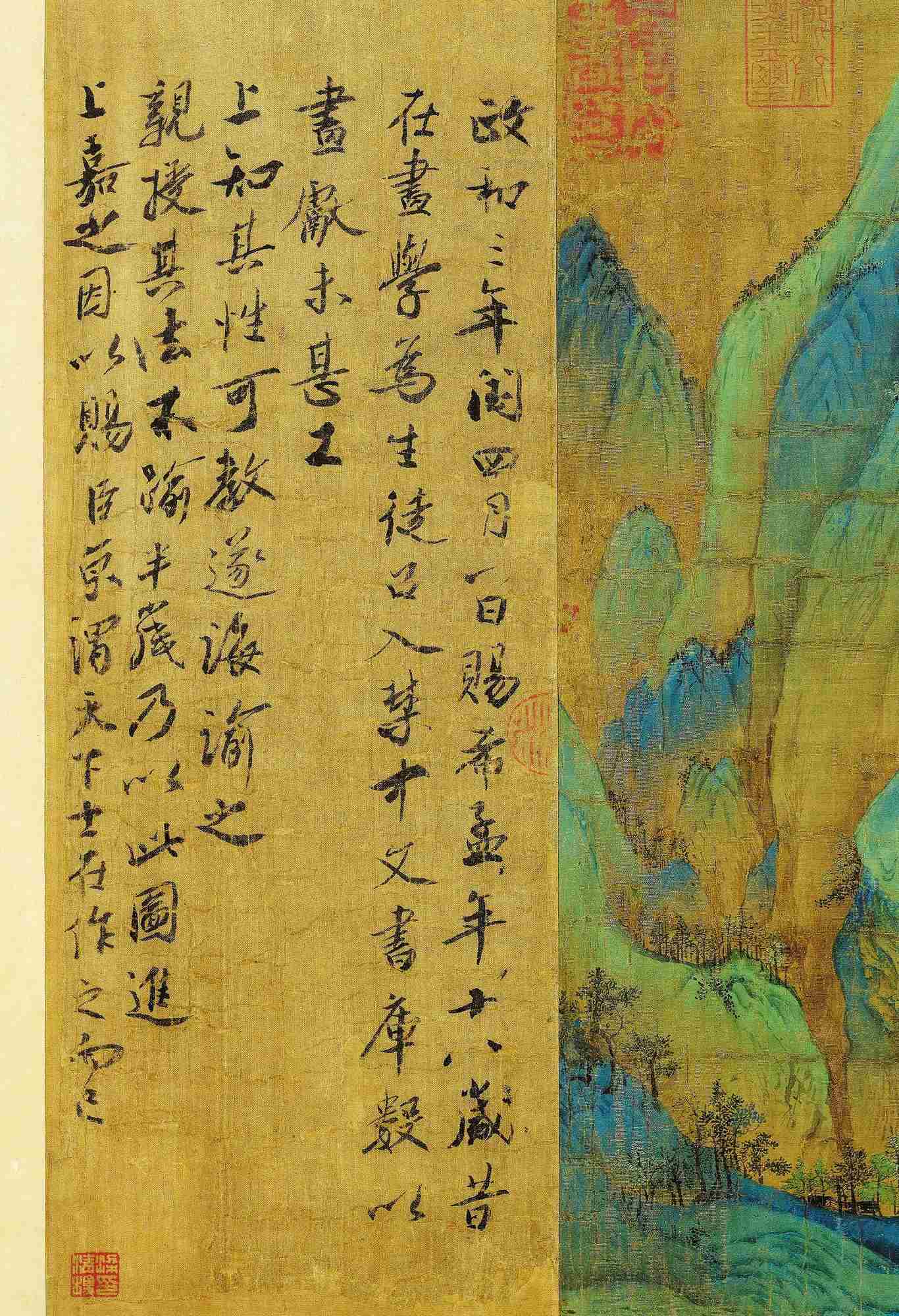 政和三年闰四月一日赐。希孟年十八岁,昔在画学为生徒,召入禁中文书库。数以画献,未甚工。