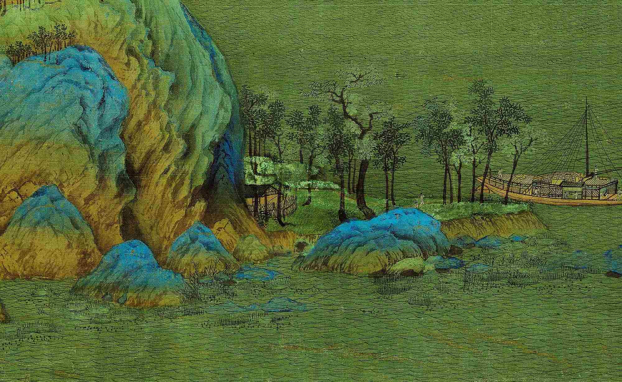首先是颜色。我们之前说过,宋朝之前的绘画以青绿色为主,叫作设色。五代末北宋初年,南北派山水诞生,统一一点便是用黑白水墨,不再过多使用颜色。而《千里江山图》是设色山水长卷,并且长达十一米,这在五代之后非常少见。