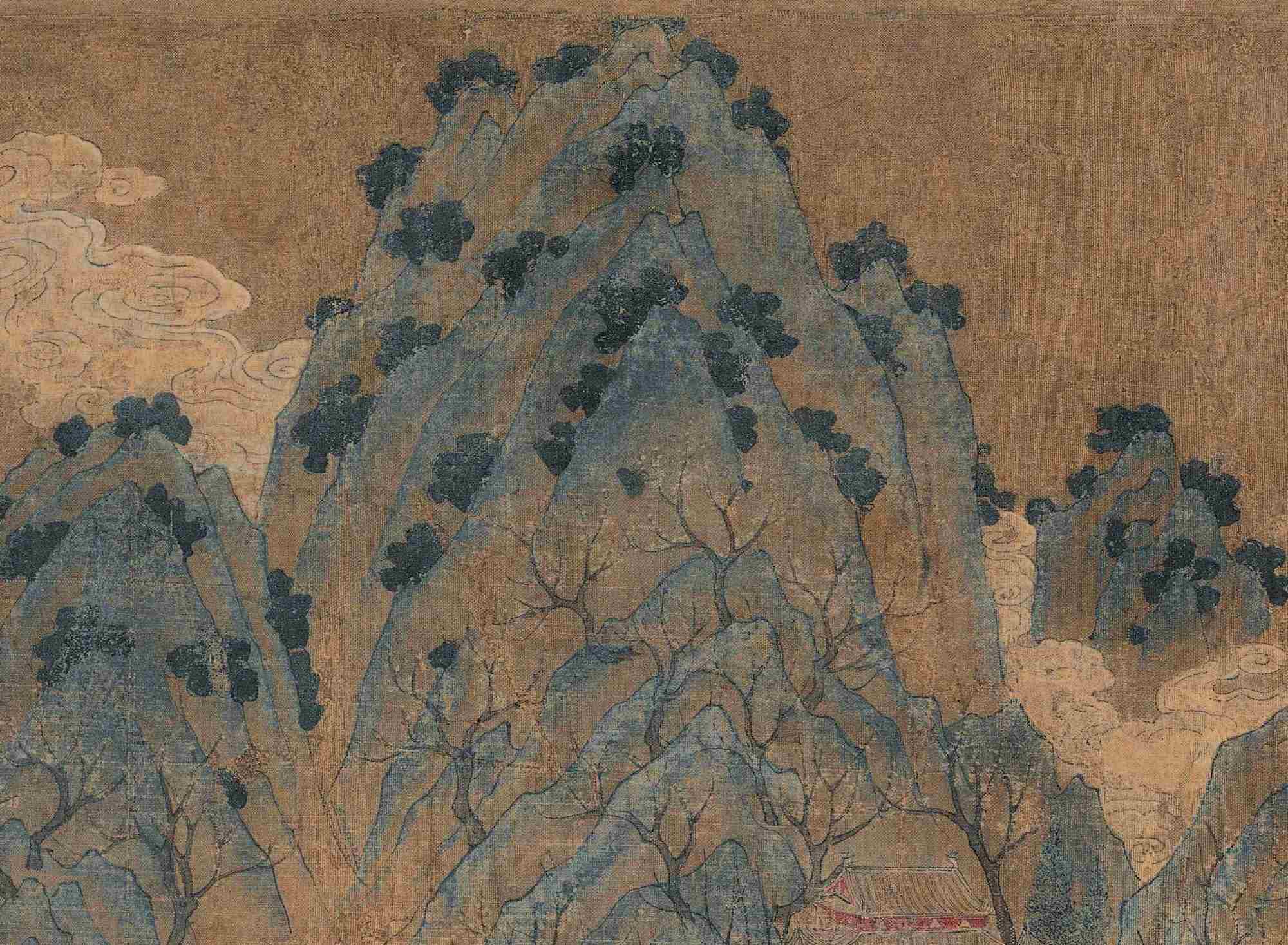 “游春”的重点是春日郊游,特别讲究季节性,不像《洛神赋图》只为了讲故事而可以忽略季节。春天来了,绿叶子都长出来了,山怎么能是光秃秃的呢?所以展子虔用毛笔在山顶点出毛茸茸的绿色,以此象征春天。咱们平时看远山是不是也看不清树的样子,只看得到山顶一团团绿色呢?这个绿是不是有点接近蓝色?在中国画的颜料里,这种颜色叫作石青,也叫花青,听名字它就是属于绿色系的。在生活中,我们看远山一团团茂密的绿色树冠连在一起,要比眼前的树叶颜色深,无限接近于蓝色,其实这和早春的嫩叶肉眼看上去是黄色而不是绿色,是一个道理。这就是“苔点法”的妙处,既点出了绿色,又画出了空间感。山周围还有云雾缭绕,山顶冲破云雾,也是显示山很高很远的描绘方式。