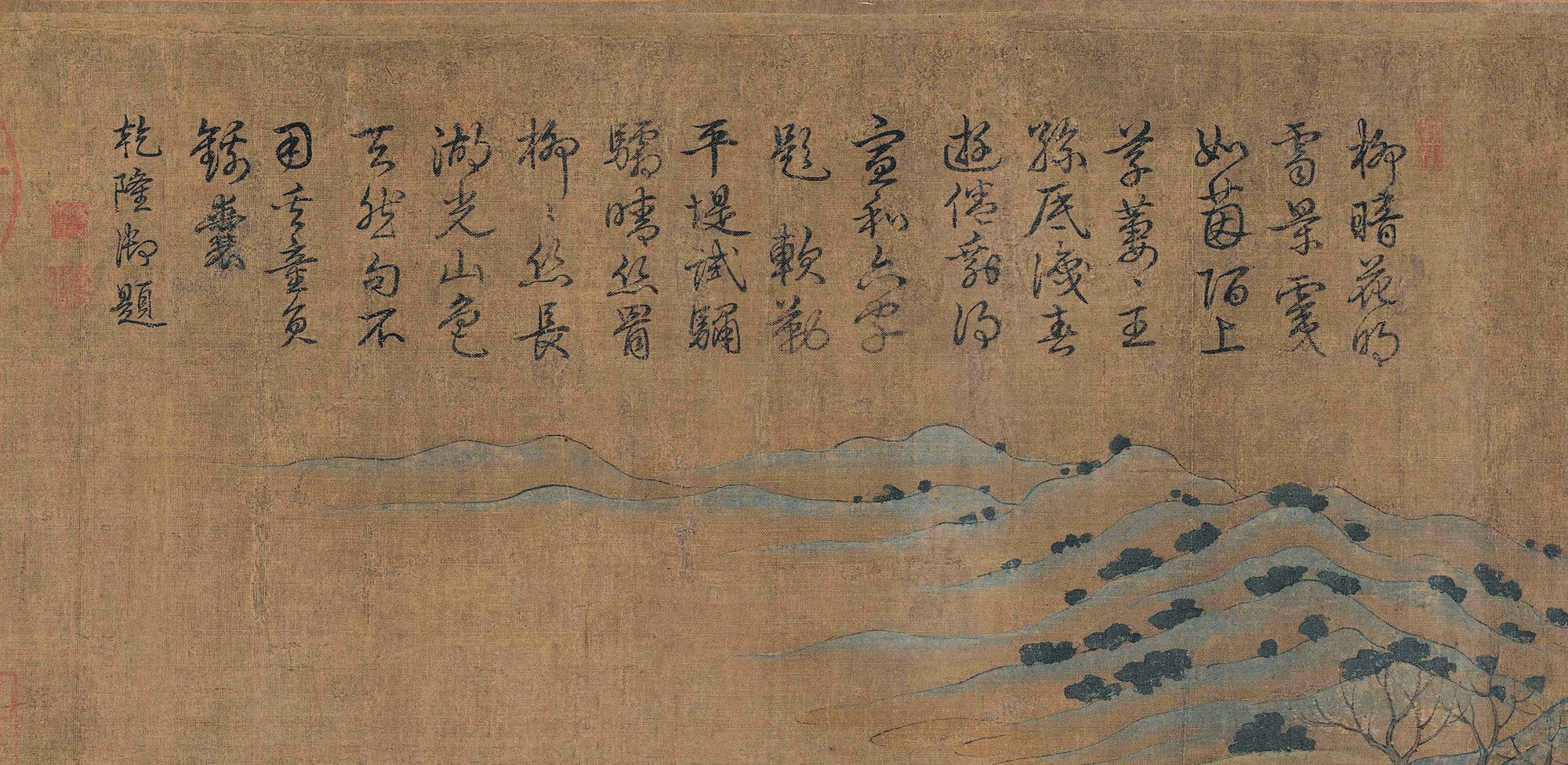 中国收藏家和西方收藏家不同,一幅画被收藏后,不管是个人还是皇家,藏家都会留下自己的痕迹,像宋徽宗就在卷首留下他标志性的瘦金体所书的“展子虔游春图”。有的藏家会在卷尾写下自己对这幅画的评语,隔开一段距离装裱在后面,这种方式叫作题跋。