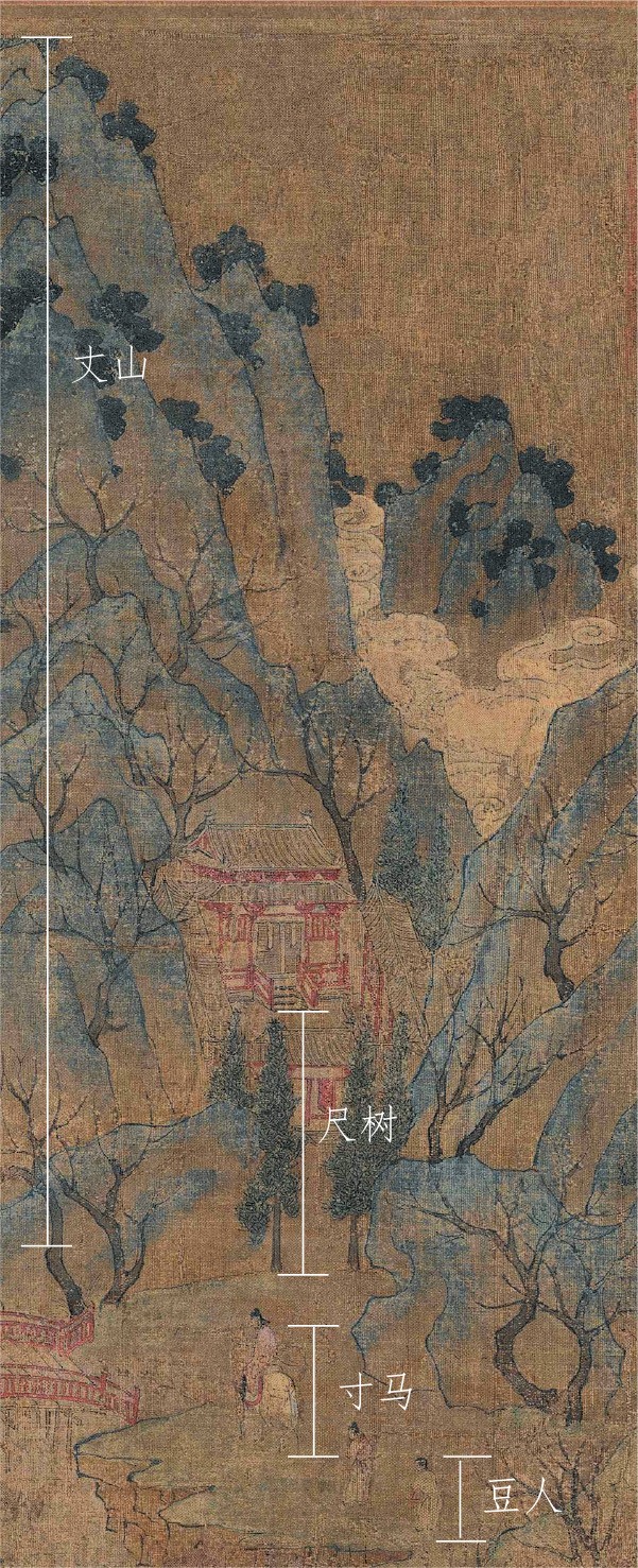 到了隋代,画中主角已是山水,而非人物。山水成为画中主角,意思是山水和人物之间有了正常的比例。在《洛神赋图》中,人是主角,所以人大于山,人与山不成比例。而《游春图》最为后世评论家称赞的正是“ 丈山、尺树、寸马、豆人 ”,这是新的秩序关系。展子虔有条不紊地在小小画幅上安排了自然界和人的种种足迹,更符合肉眼所见,也更符合科学的自然观。他用画笔替古人承认自然的伟大壮丽和人类的渺小,以及人类对自然无穷无尽的探索。