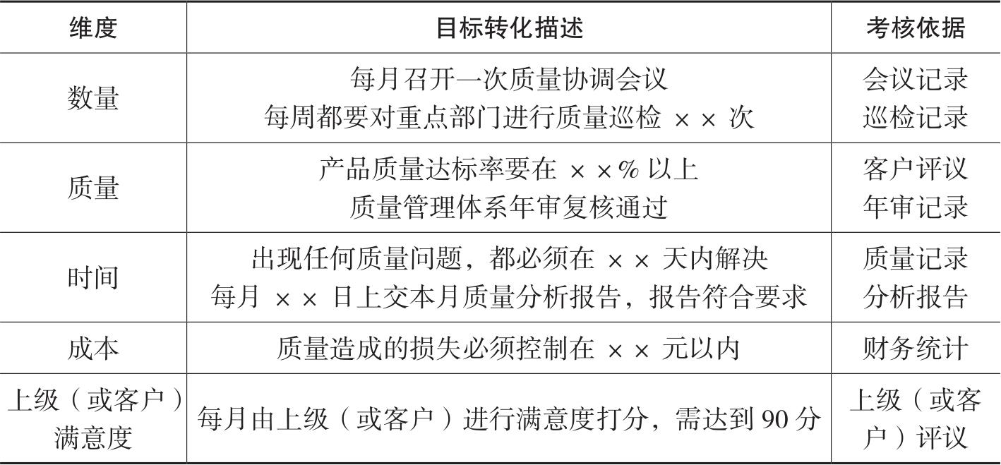 如表3-1所示,该企业从数量、质量、时间、成本、上级(或客户)满意度5个方面将目标转化,并对每个方面的目标都进行了明确规定,使得目标是可衡量的。