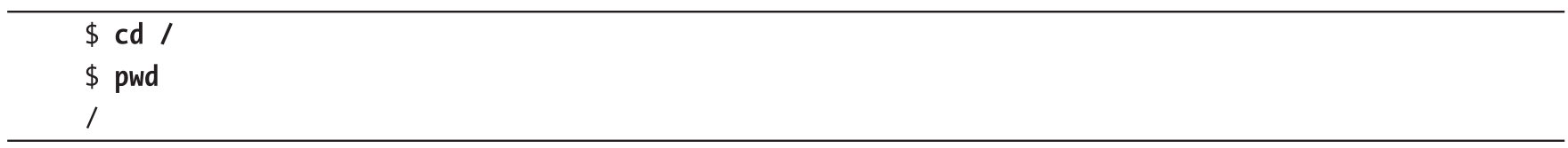 我们也可以使用绝对路径(absolute path)来更改目录,它是指相对于根目录的路径。根目录用斜杠符号(/)表示。让我们尝试使用绝对路径来转到根目录: