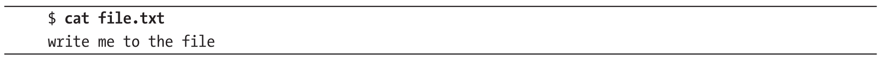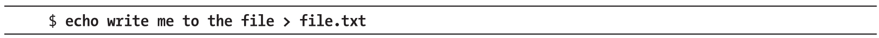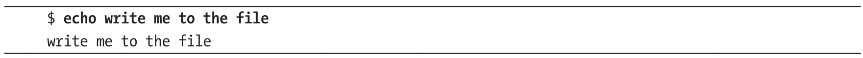 上面的命令比我们目前见到的其他命令要更复杂。它分为两个部分。符号>的左侧是第一部分,使用echo命令输出文本“write me to the file”。我们可以单独运行这个命令,看看它能做些什么: