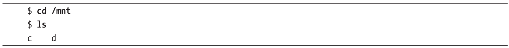 使用绝对路径(从/开始)转到/mnt很关键。ls命令列出了我的两个驱动盘:C盘和D盘。要打开其中的一个,只需更改目录: