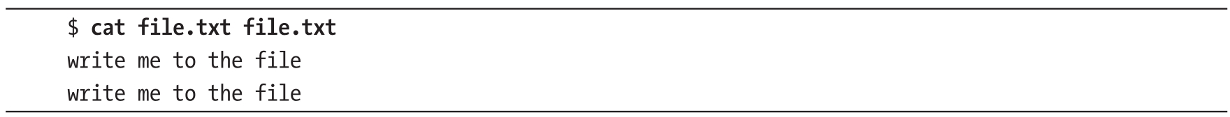 cat命令会输出文件内容。该命令是concatenate的缩写,它会拼接传递给它的文件内容。事实上,我们可以将同一个文件重复传递到cat,以查看拼接结果: