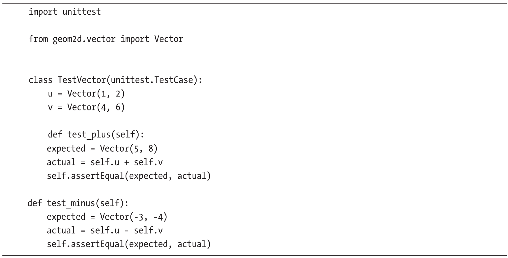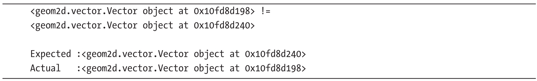值得注意的是,这次我们使用的是断言方法assertEqual,它会使用==操作符来比较这两个参数。如果我们在Vector类中没有重载这个操作符,即使结果是正确的,测试也会失败。尝试一下:在Vector类中注释掉__eq__(self,other)方法(在该行的开头添加#字符),然后重新运行测试。
