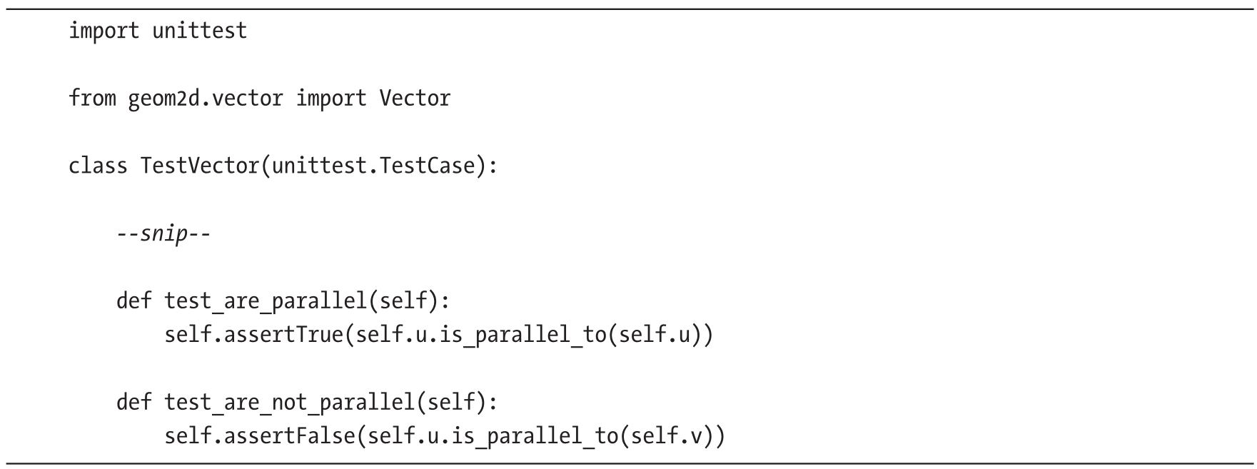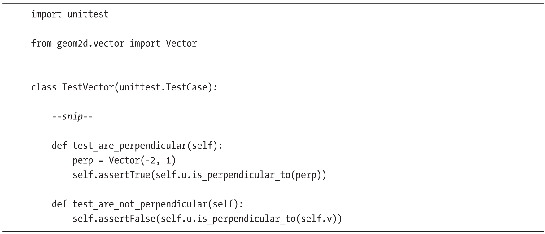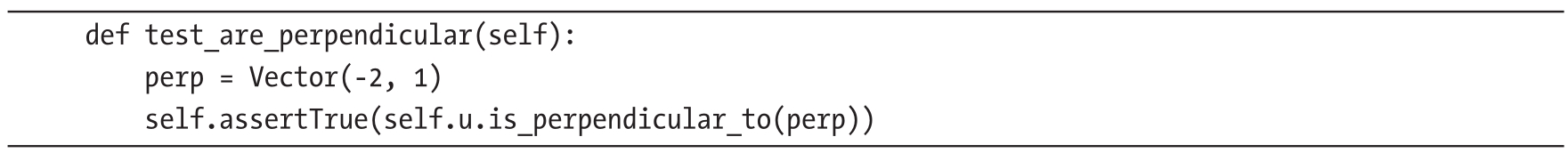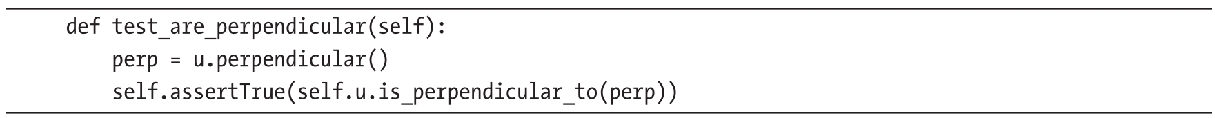 接下来,我们将测试is_parallel_to和is_perpendicular_to方法。因为我们检查的是布尔表达式,所以我们希望有两个测试,一个检验两个向量是平行的(正向测试),另一个检验它们不平行(反向测试)。对于正向测试的情况,我们将基于这样一个事实,即向量总是平行于它自身。在TestVector中输入清单4-31中的代码。