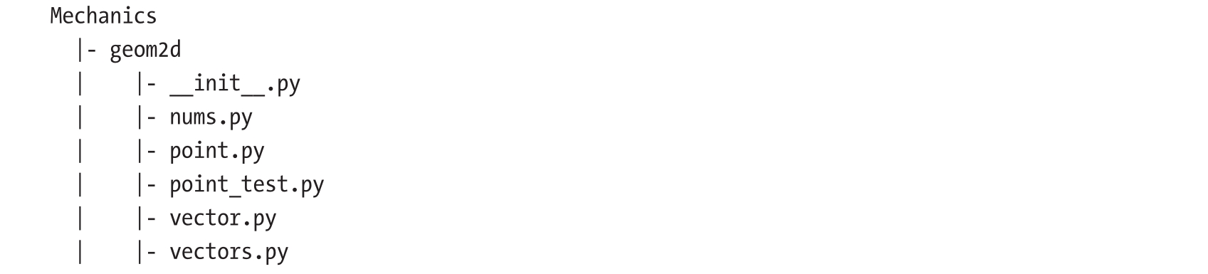 我们为Point类编写的第一个方法是distance_to,让我们从它开始尝试单元测试。在geom2d包中,创建一个名为point_test.py的新文件。整个项目的结构应如下所示: