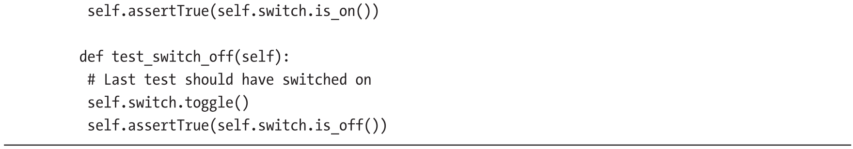 看到test_switch_off是如何依赖于test_switch_on了吗?通过使用一种名为toggle的方法,如果测试以不同顺序运行,并且switch在测试运行时处于off状态,那么我们可能会得到错误的结果。