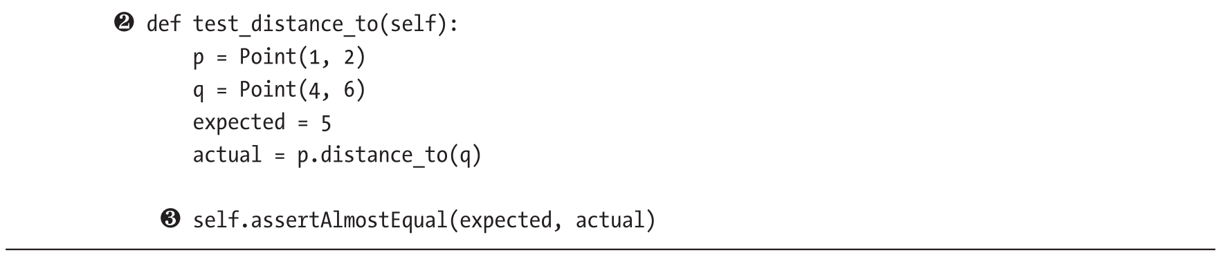 接下来定义test_distance_to方法❷。方法名以单词test_开头是很重要的,因为这是类识别测试方法的方式。你也可以在类中定义其他方法,但只要它们的名称不以test开头,它们就不会作为测试被执行。在方法内部,我们创建了相距5个单位的两个点,并断言它们的距离p.distance_to(q)接近这个值。