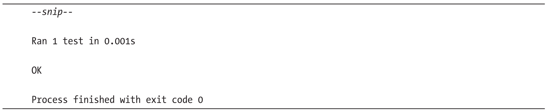 PyCharm之外的其他IDE可能有自己运行测试的方式。但是,不管用什么IDE,你总是可以从控制台运行测试。打开控制台或shell,确认在Mechanics项目的目录中。然后执行以下命令: