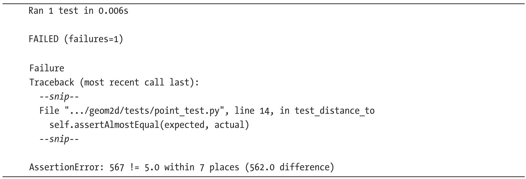 断言错误出现之前的信息是回溯(traceback),也就是Python执行时的路径,直到出现错误。如信息所言,最接近失败的调用出现在清单后面。可以看到,测试执行失败出现在point_test.py文件中(毫不奇怪)的第14行(你的可能有所不同),在一个名为test_distance_to的测试中。当你修改代码并运行测试以发现测试是否失败时,这些信息将被证明超级有用,因为它会告诉你具体而准确的失败信息。
