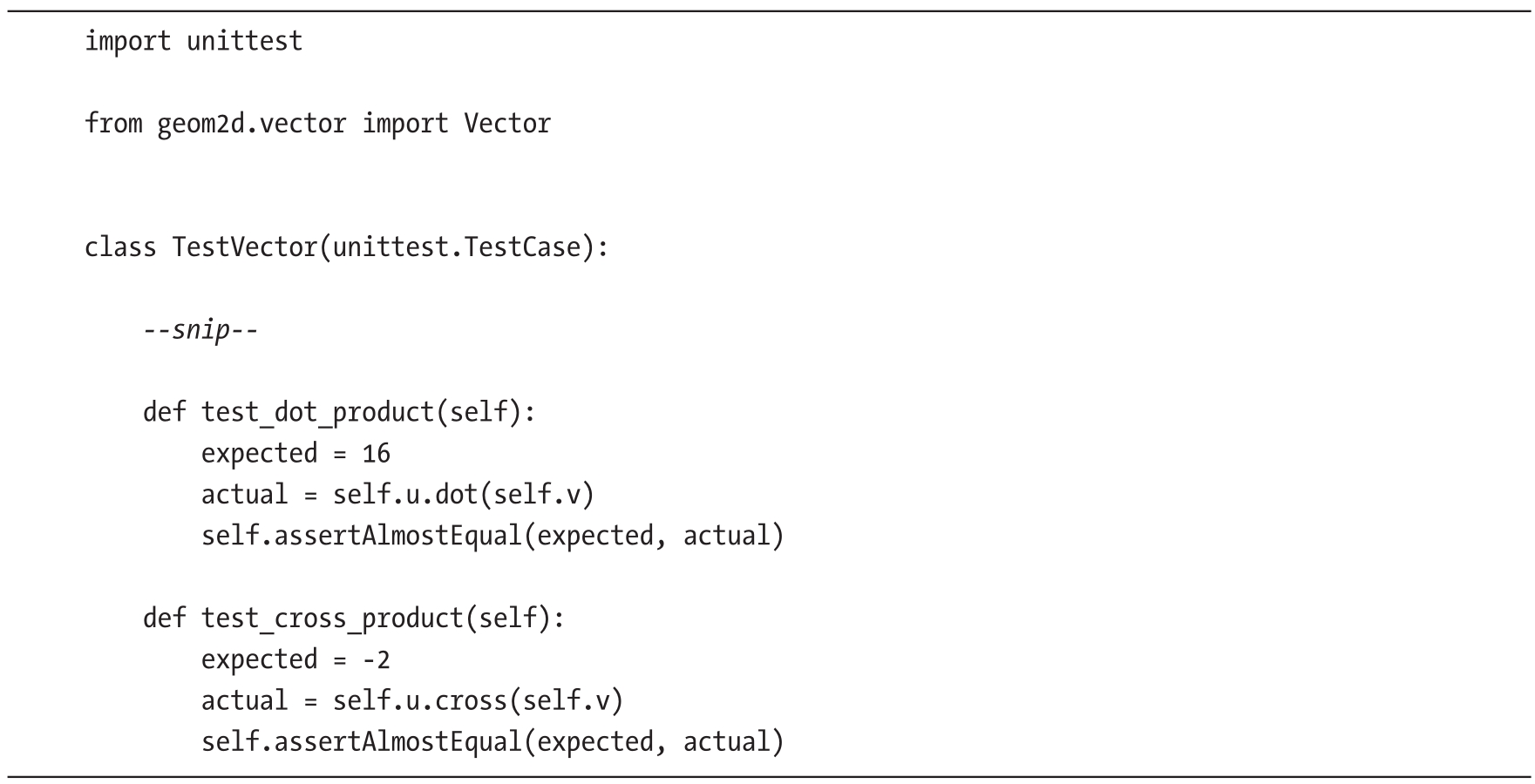 我们已经涵盖了Point类和Vector类的部分方法的测试。现在你已经有了所需的知识,请尝试测试Point类和Vector类中的所有方法。我将把这个留给你作为练习。如果需要帮助,你可以看看本书提供的代码:它包括很多单元测试。找出所有我们没有测试的方法,并编写你认为需要的测试,以确保它们正常工作。我鼓励你去尝试,但是如果你仍然觉得单元测试对你来说很陌生,不要担心,我们将在其他章节中继续编写单元测试。