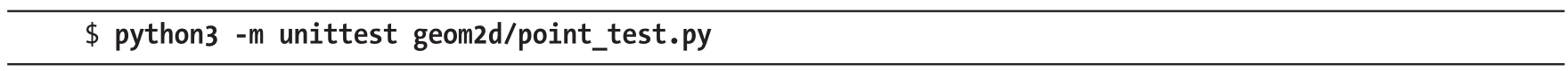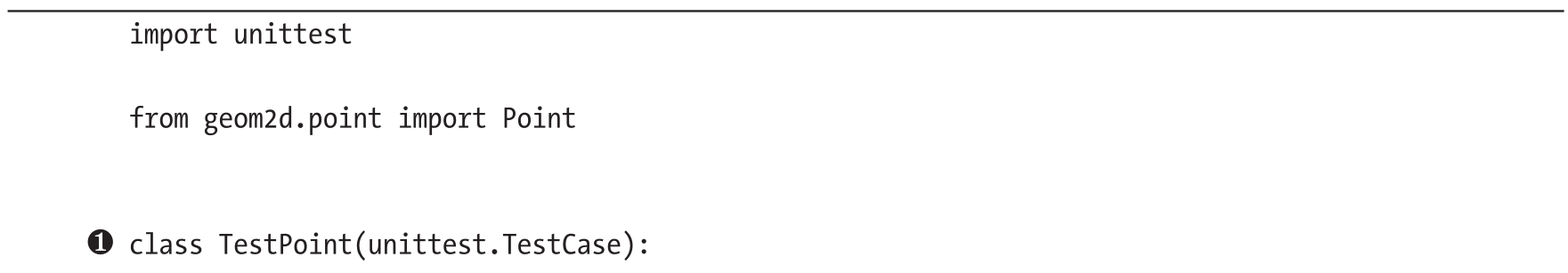 我们首先导入Python附带的unittest模块。这个模块为我们提供了编写和执行单元测试所需的大多数基础代码。导入Point类之后,我们定义TestPoint类,它继承自unittest.TestCase❶。TestCase类定义的断言方法的集合非常好,当我们继承它时,我们可以在类中访问这些方法。