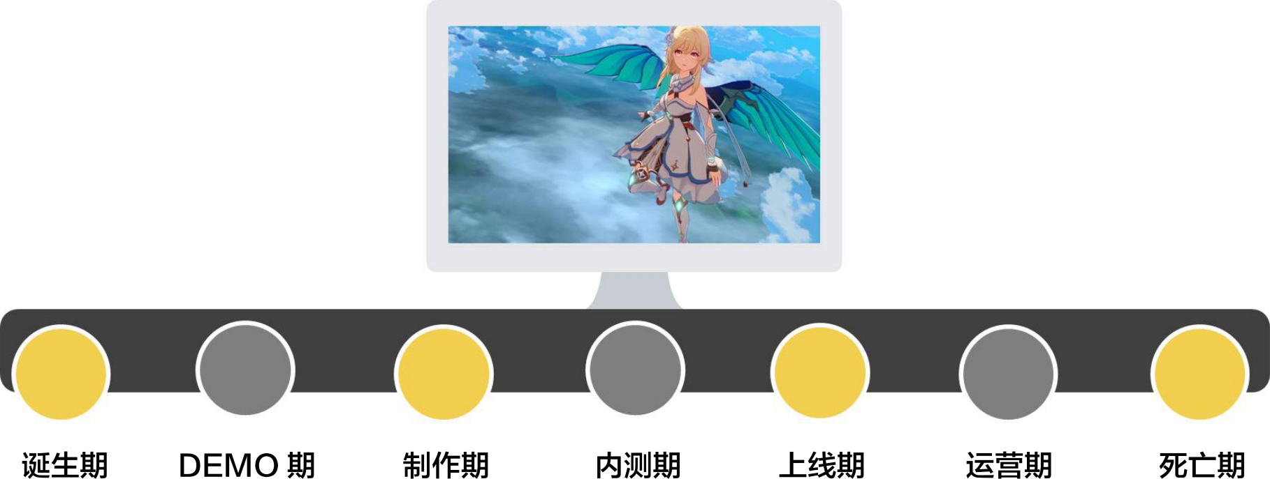 人的一生就是在不同的阶段遇到不同的人并做不同的事,一款游戏也有不同的阶段。我们把一款游戏的整个生命历程分为诞生期、DEMO期、制作期、内测期、上线期、运营期和死亡期。它们一般会依次出现,但也存在受各种因素的影响而跳跃式发展或因为效果不佳而返回前面阶段的情况。