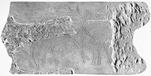 图 2—1 驯鹿与鲑鱼,约 1.7 万年前马格达林时期(Magdalenian)的雕刻画,出土于法国的洛尔特岩洞遗址,现珍藏在位于圣日耳曼昂莱市(St. Germain-enLaye)的法国国立考古博物馆(Musee des Antiquites Nationales)(本图片由布里奇曼影像提供)