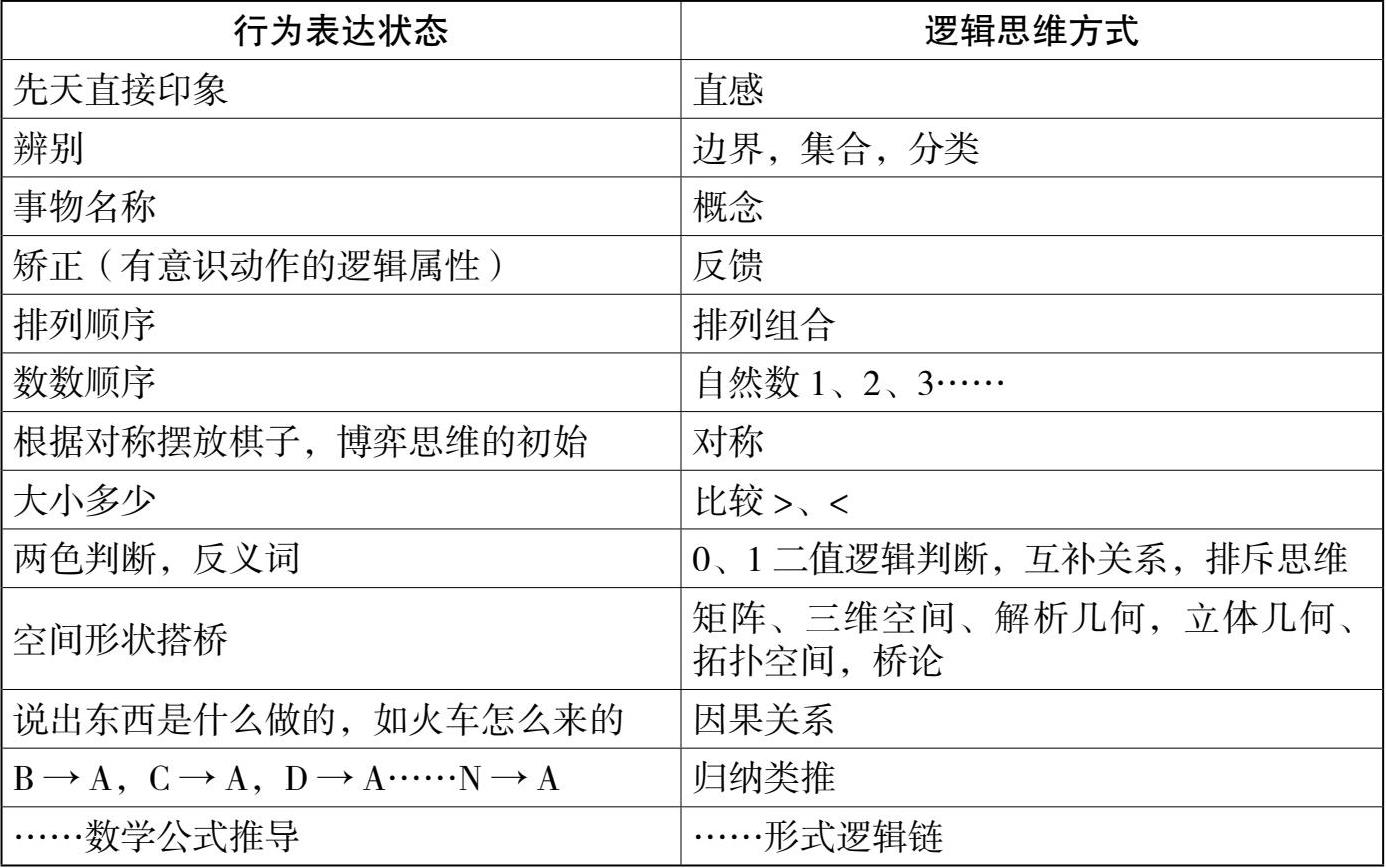 思维认识从整体到个别的解析过程,前面已经叙述了思维认识发育的原初状态是整个外部世界信息印象记在脑海中,全息记录外界信息,即所谓思维的先天构架。对整体印象记录的外界信息进行解析过程就是思维发生、发展过程。每一步解析的链条都是思维的智力进步。根据当今已经普遍观察到的各阶段婴幼儿各种智力行为的表现,可以看到每个年龄段不同类型智能发育的过程,实际上也是逻辑思维形成的过程。见表2-1所示,幼儿行为与逻辑思维发展对应关系。